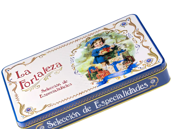 Estuche metálico clásico con ilustración de niños sentados en un banco disfrutando de los productos de La Fortaleza. En el interior del envase de 1,1 kg encontramos: Polvoroncitos de Almendra – Mantecaditos – Bocadito de Soto – Guindas Marrasquino Bañadas en Chocolate Negro – Soles de Naranja Bañados en Chocolate – Alfajor de Almendra Mini – Mantecados de Artesanía – Trufas Al Brandy Bañadas en Chocolate – Empanadillas Rellenas de Yema – Mantecaditos de Aceite Y Almendra – Polvoroncitos de Aceite Y Almendra – Deseadas de Almendra – Delicias Bañadas en Chocolate – Frutas de Aragón Bañadas en Chocolate y Rosquito de Vino.